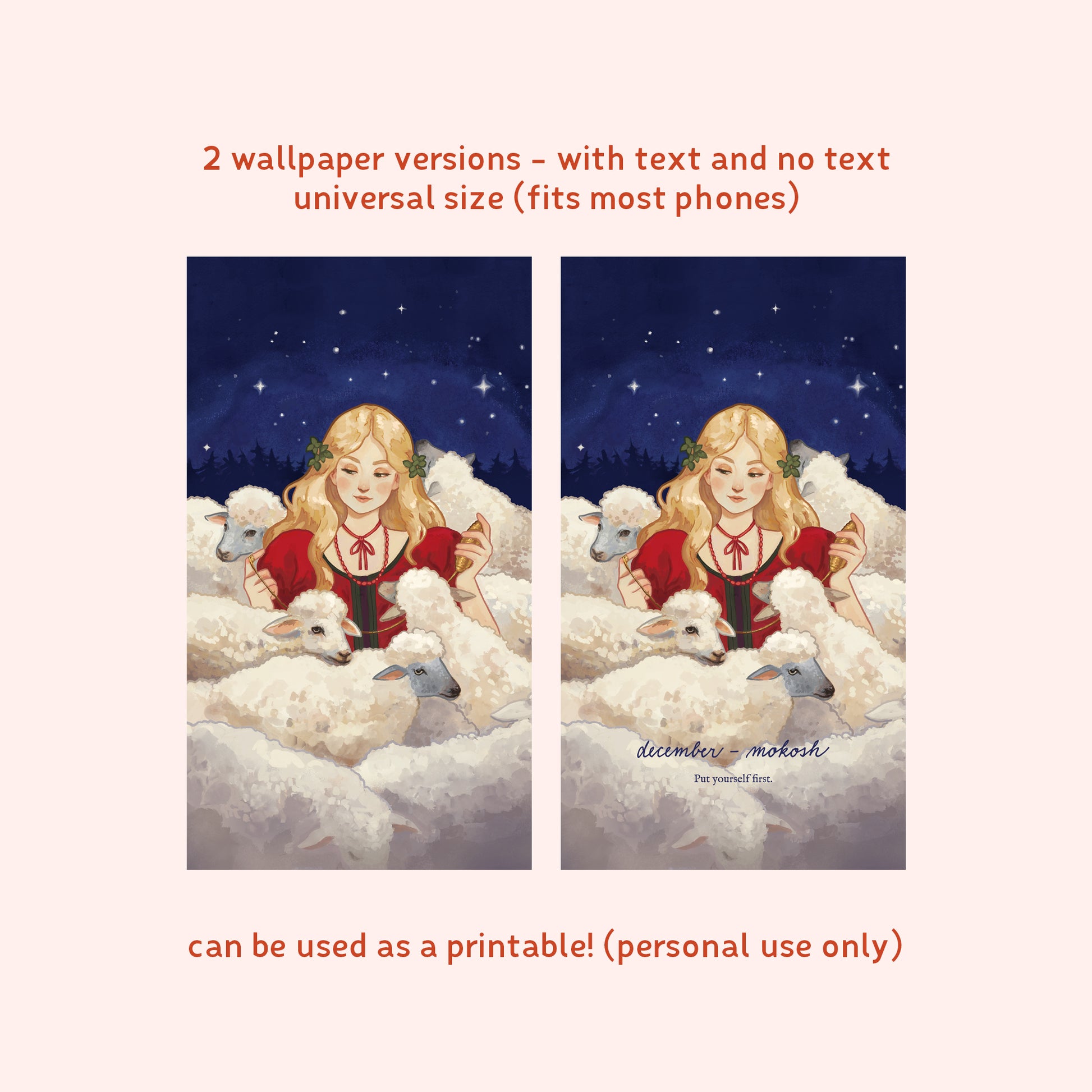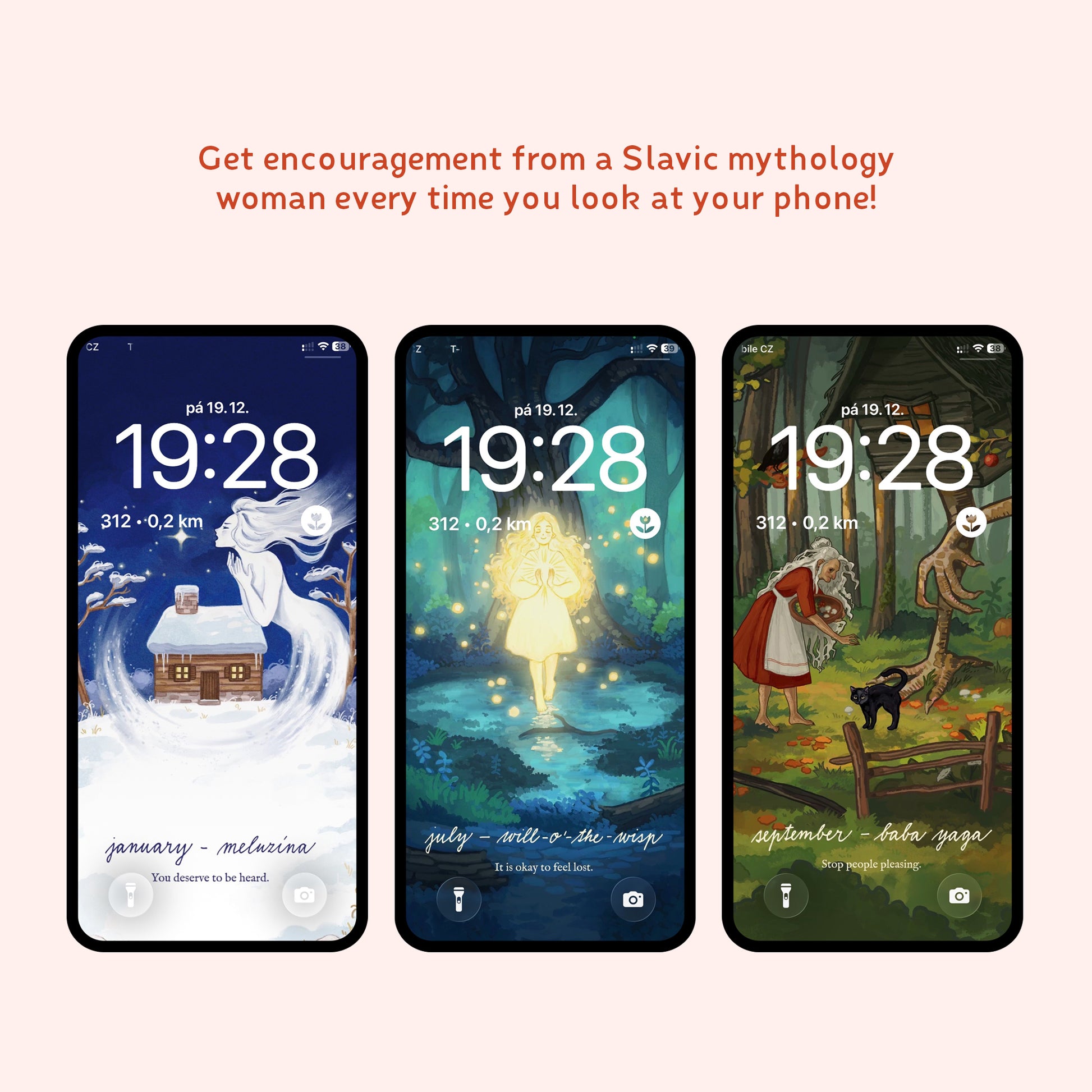 The Slavic mythological women in these wallpapers are here to help you to break out of these expectations and find your real, authentic self. Each month, a mythological being will bring you a message of comfort or strength. She will be on your phone, reminding you that it's okay to age, that you should put yourself first from time to time, or to speak up when something bothers you. It tackles the topics of women's sexuality, community, emotions, body image, and more.
