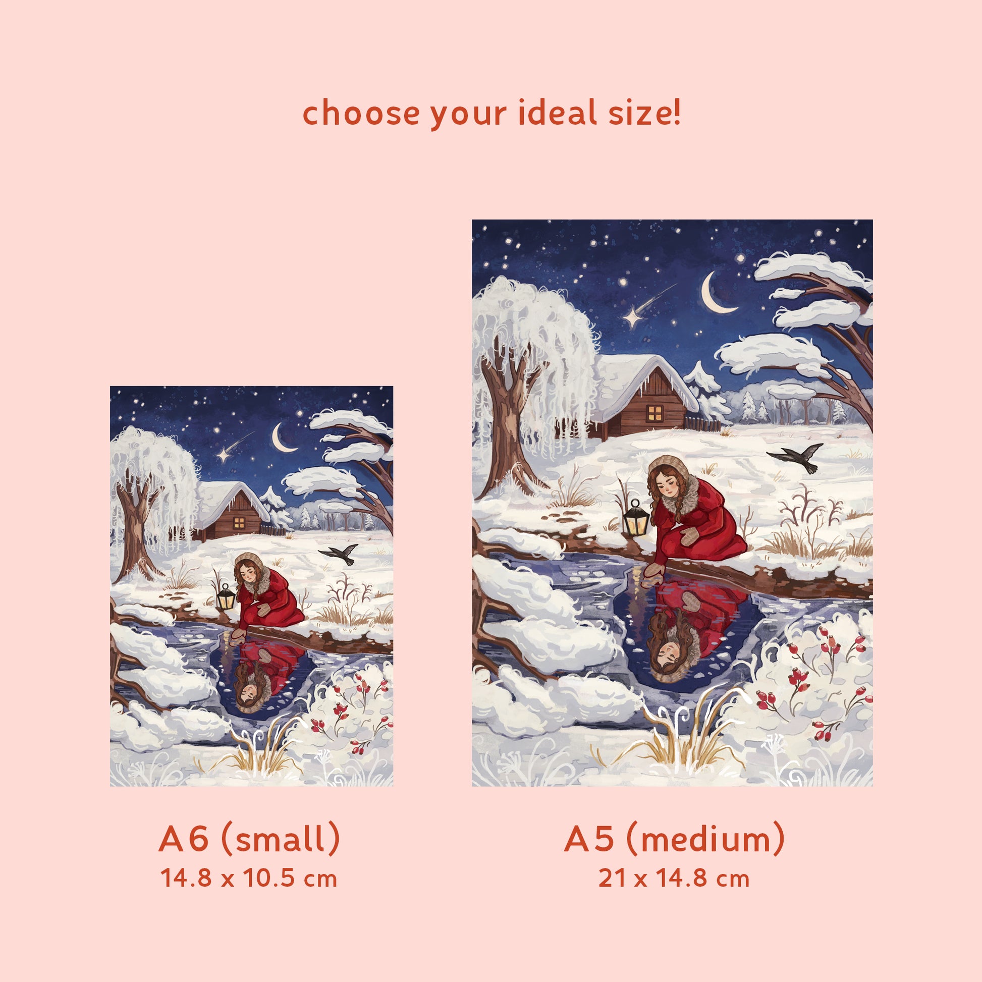 There is a way to tell the future during Christmas Eve:  girls go break the ice on frozen water to look into its depths, believing that they will see their future love there. But what if instead they saw an older version of themselves, who is complete on her own and does not need a man to be so? This illustration is for all the women who have ever had enough of how society emphasizes that a person cannot be fulfilled without romantic love.