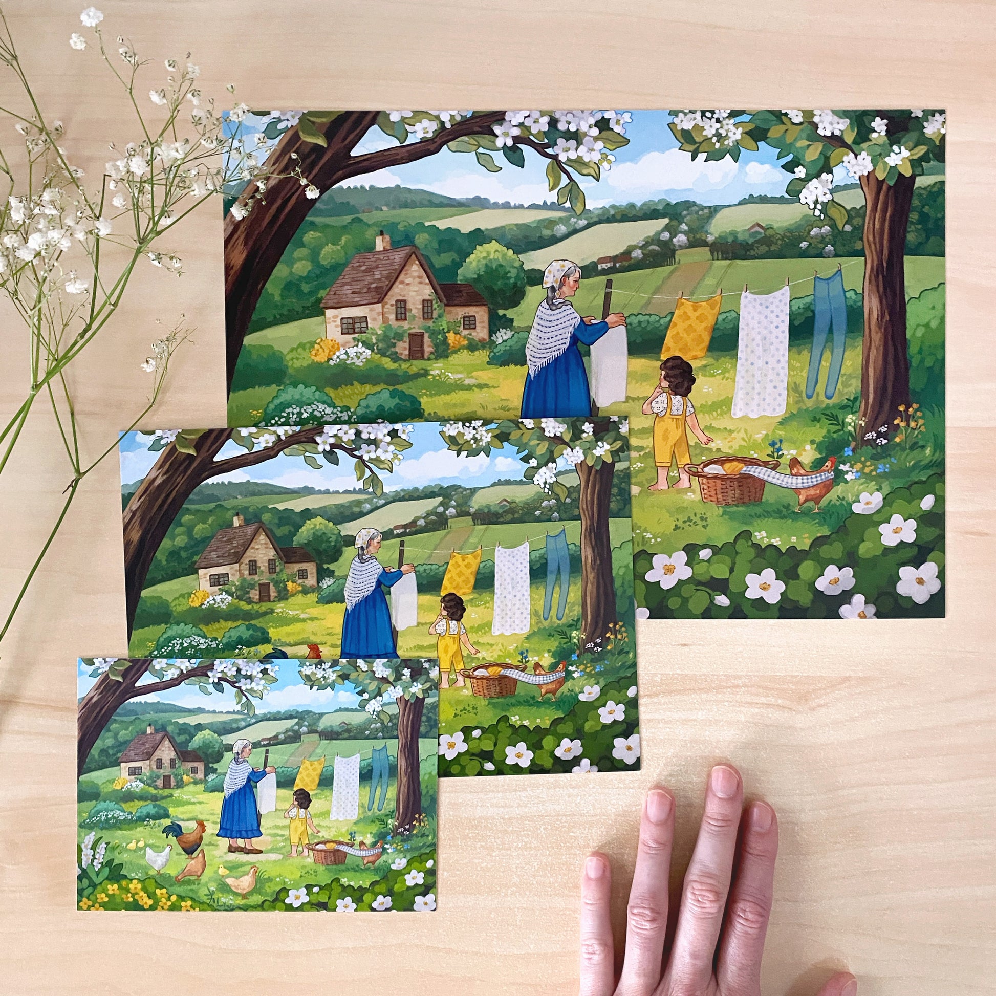 Sometimes, being an adult sucks. The weight of responsibilities, work, world, emotions, and the fast pace of life can be too much. Maybe you need to step back into your childhood just for a second, when things were more simple and there was always a responsible adult to lean on. What advice would a wise grandma give you? Ask the one in the print, while helping her do the laundry under the blooming trees! Pick the size you prefer: a small A6 print that will fit any tiny space in your gallery wall or a medium A5 print that better showcases all the details!