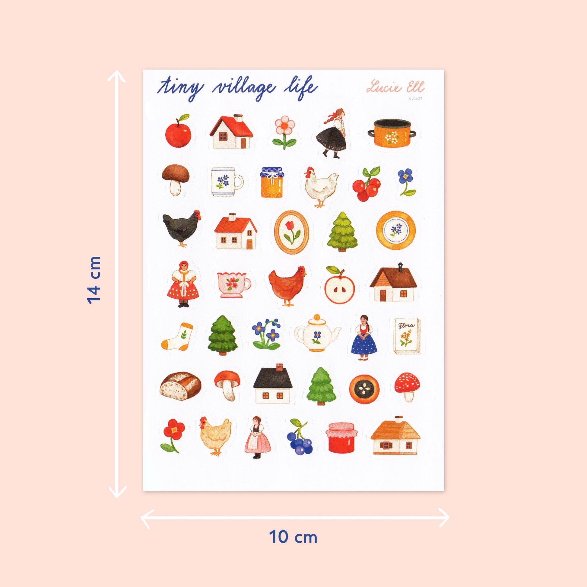 Then this tiny village life sticker sheet is perfect for you! It contains 39 small unique everyday life stickers like houses, food, chickens, flowers, dishes, and traditional folk dress. Add some cuteness to your life with this sticker sheet!